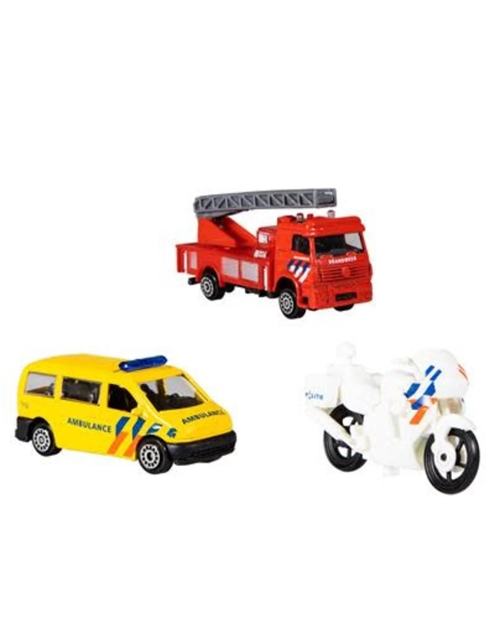 Ga op pad met deze hulpdienstenset, bestaande uit een brandweerauto met ladder, ambulancebus en een politiemotor. Schaal: 1:64. Vervaardigd van die-cast en kunststof. Geschikt voor kinderen vanaf 3 jaar.