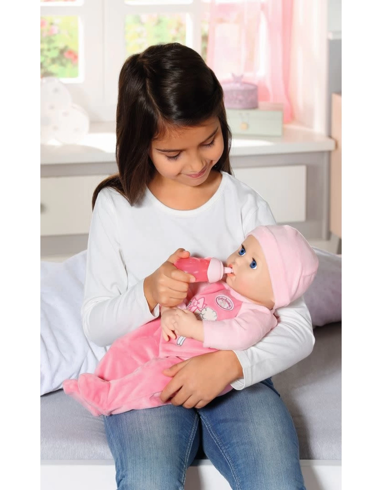 Met haar zachte lijfje en levensechte functies vergezelt Annabell de de allerjongste poppenmama’s en -papa’s de hele dag. Na het wakker worden ’s ochtends drinkt ze graag water uit haar flesje. Ze beweegt haar mond tijdens het zuigen aan het flesje en je kunt goed horen dat ze van haar ontbijt geniet. Als ze klaar is met drinken, laat ze een boertje en is ze klaar om te spelen. Annabell lacht opgewonden als je haar op je knie laat stuiteren. Ze houdt ook erg van kietelen en giechelt blij als je over haar buikje kriebelt. Soms laat ze een windje als ze wordt gekieteld. ‘Oeps! – Giechel!’ Zelfs het vrolijkste poppenkind kan soms een slecht humeur hebben. Als dat gebeurt, jammert Annabell en huilt ze echte poppentranen. Maar er zijn een heleboel manieren om haar weer te troosten. Een van haar favoriete manieren is haar speentje, waar ze luidruchtig aan zuigt met zichtbare bewegingen van haar mond. Als het tijd is om te gaan slapen, kun je haar in slaap wiegen. Daar moet ze van gapen, waarna ze haar oogjes dichtdoet en in slaap valt, waarbij ze zwaar ademt.