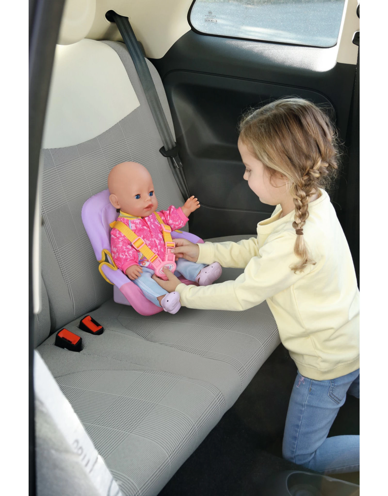Als BABY born op avontuur gaat met haar mama en papa nemen ze vaak de auto. BABY born heeft een comfortabel autostoeltje in het roze en paars. Bello de hond op de rugleuning gaat ook graag mee voor een autorit om nieuwe dingen te ontdekken. De contrasterende riempjes zorgen ervoor dat BABY born veilig en comfortabel zit. Nadat je de gele riempjes hebt vastgemaakt, kun je de autogordel heel makkelijk door de uitsparingen in de zijkanten halen om BABY born veilig te vervoeren.