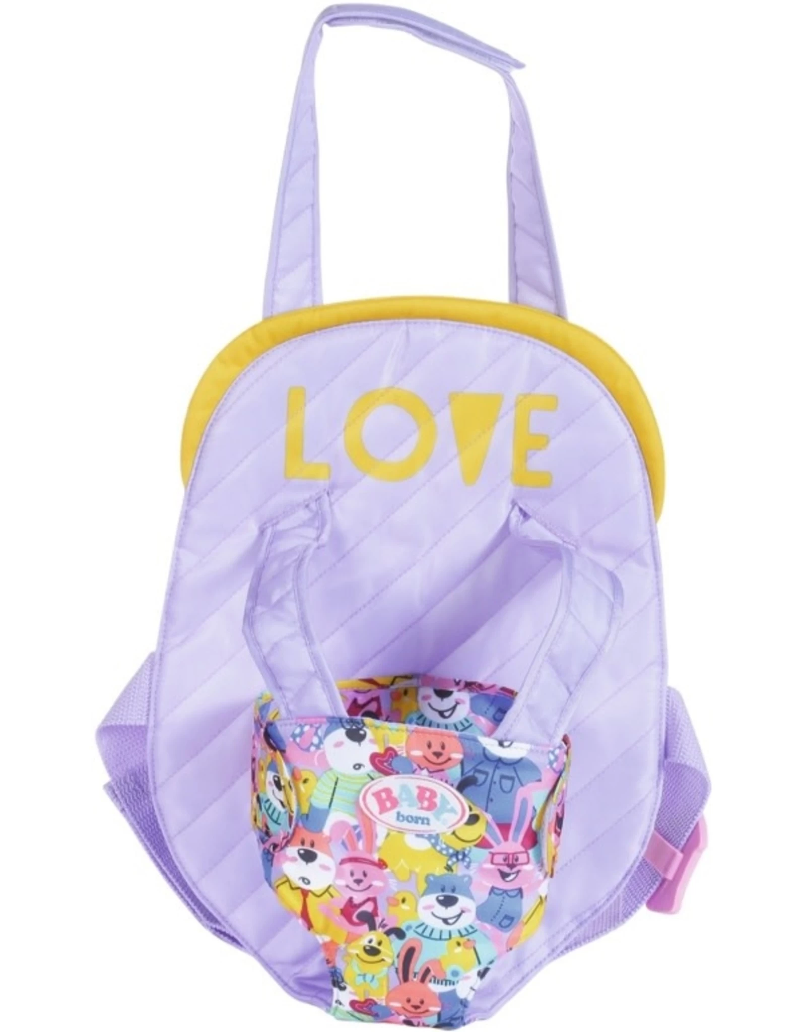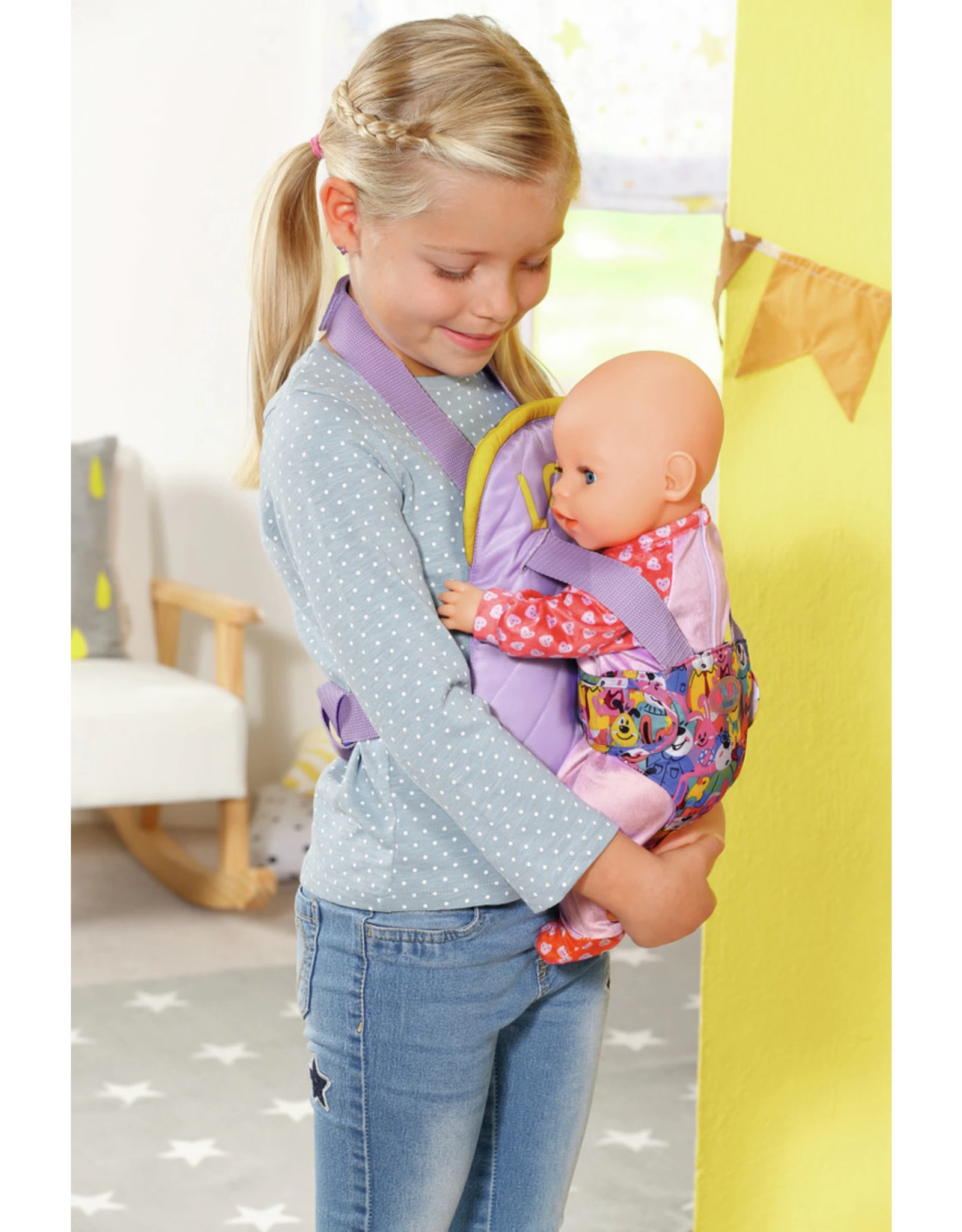 BABY Born is dol op een wandeling door het park. Er valt ook altijd zoveel te ontdekken. Er huppelen konijntjes door het gras, zwemmen eendjes op de vijver en er rennen honden langs. Net als de dierenvriendjes op haar draagzak. Het enige dat nog ontbreekt, zijn de beren. Maar er zijn wel bessen: bramen, frambozen en bosbessen. BABY Born reist heel graag in haar paarse draagzak, zodat ze zelf de zoete vruchten kan plukken en alles kan zien wat er om haar heen gebeurt. De riempjes kunnen versteld worden, afhankelijk van de grootte van het kind.Â