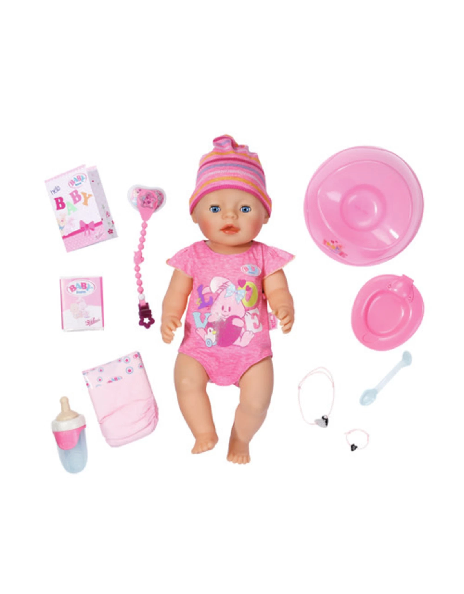 BABY born® kan haar armen, benen en hoofd bewegen en is dol op water. Als ze heel erg moe is van al het spelen, huilt ze echte tranen. Maar als je haar de speen geeft, sluit ze snel haar ogen en valt vredig in slaap.