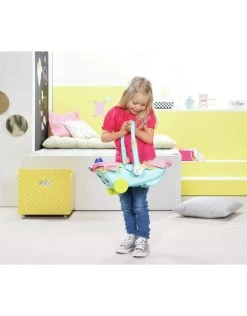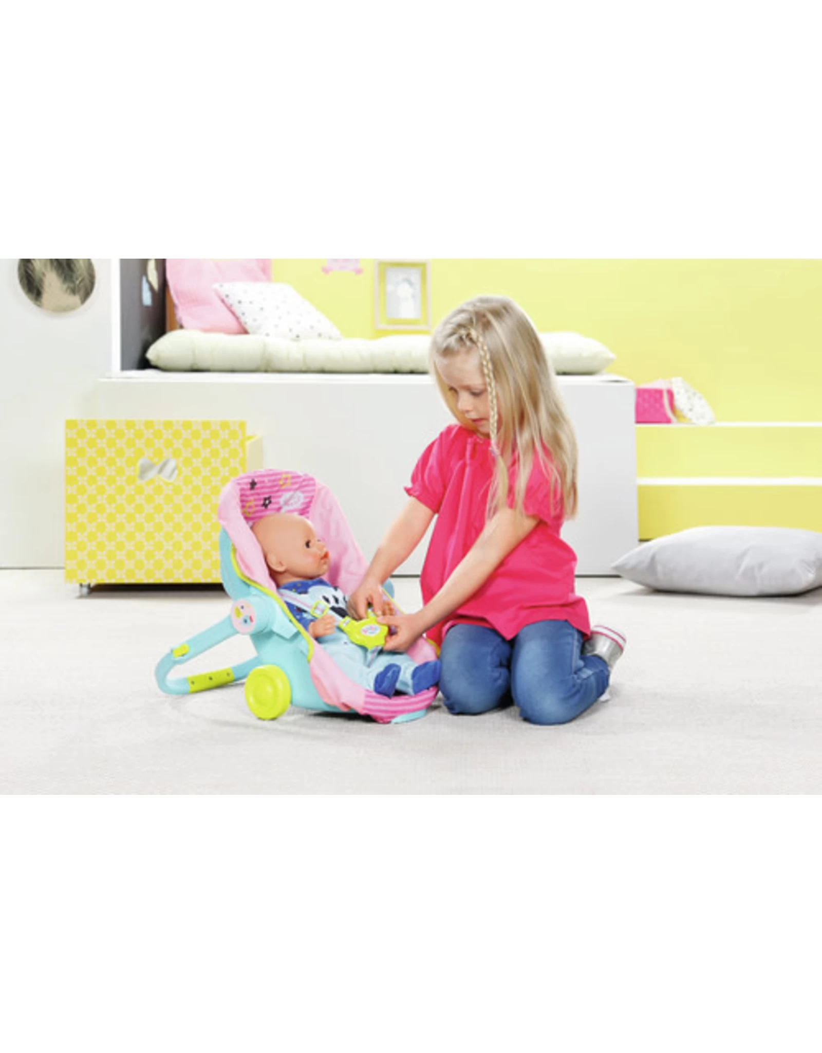 1-2-3, dit geweldige reiszitje met wielen en drie functies volgt je waar je ook naartoe gaat. Een reiszitje met drie functies, hoe werkt dat dan? Om te beginnen, is er de draagfunctie: Je kunt het reiszitje aan de greep heel handig van A naar B dragen. BABY born® kan onderweg de sterretjes tellen op de schattige, gestreepte stof. Functie twee is de zitfunctie: als je het reiszitje rechtop zet, dan wordt het een stoel van waaruit BABY born® een prima uitzicht heeft op haar omgeving. En dan nu het absolute hoogtepunt, functie nummer drie, de rolfunctie: Doordat het reiszitje wieltjes heeft, kun je BABY born® naast je laten voorttrekken. Dankzij het riempjessysteem zit je kleintje altijd veilig tijdens de reis. Ze heeft er overduidelijk veel plezier in. Kun je haar al “sneller, sneller!” horen roepen?