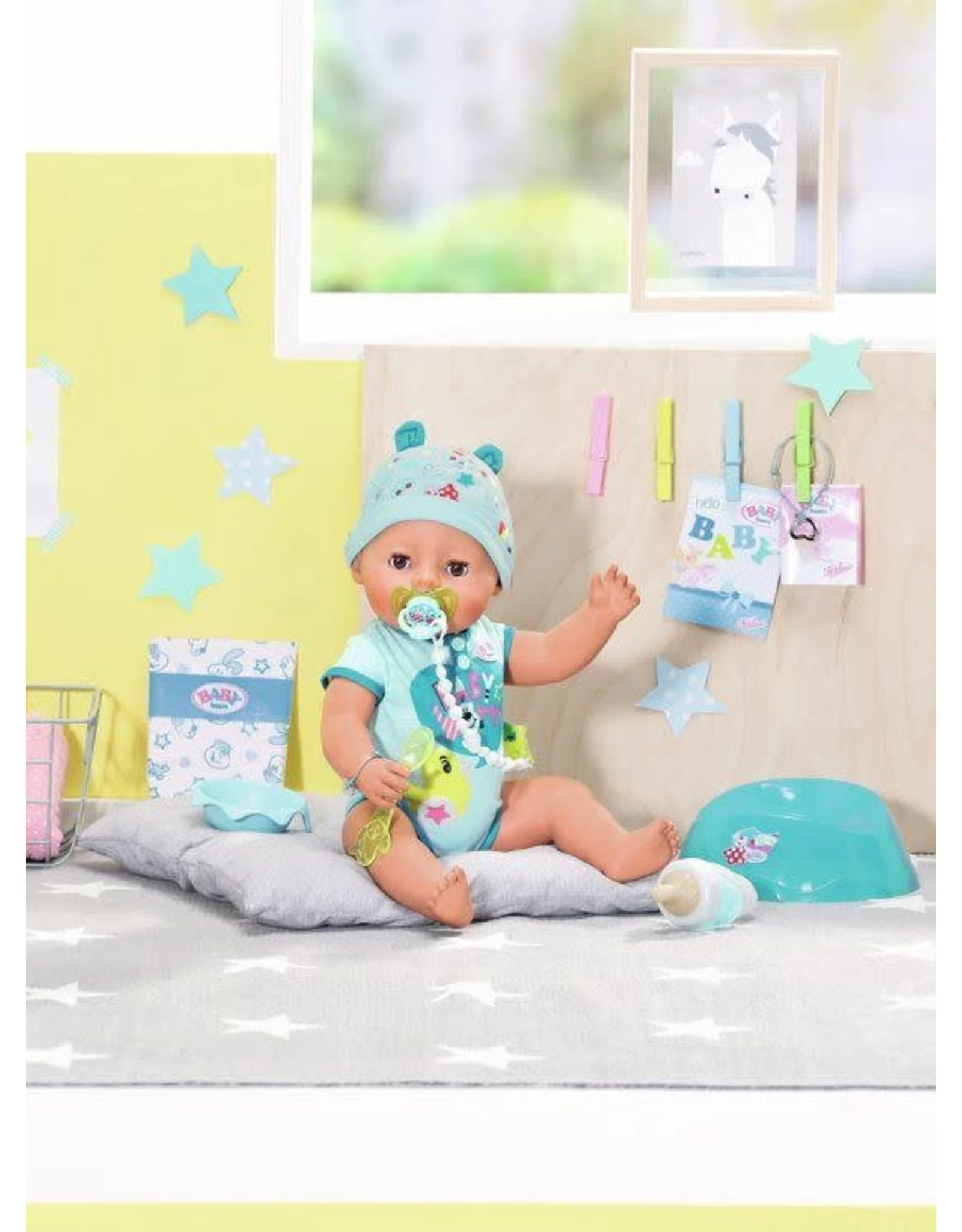– Geen batterijen vereist BABY born® Soft Touch Jongen met bodysuit en mutsje. Bevat 1 potje, 1 luier, 1 bord met lepel, 1 portie pap, 1 fles, 1 speentje met ketting, 1 geboortebewijs en 1 vriendschapsarmband elk voor het kind en de pop.