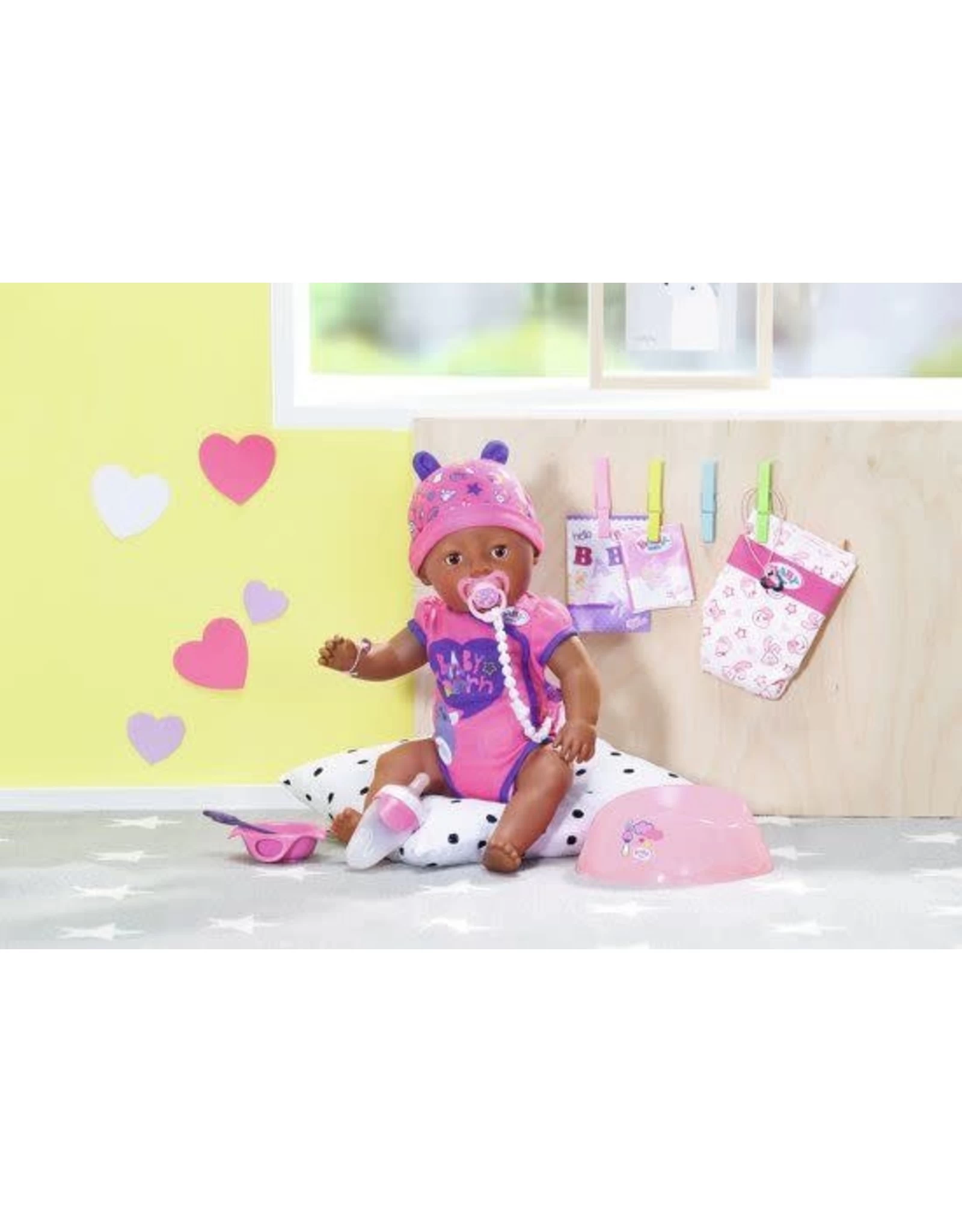 – Geen batterijen vereist BABY born® Soft Touch Meisje met bruine ogen, met bodysuit en mutsje. Bevat 1 potje, 1 luier, 1 bord met lepel, 1 portie pap, 1 fles, 1 speentje met ketting, 1 geboortebewijs en 1 vriendschapsarmband elk voor het kind en de pop.