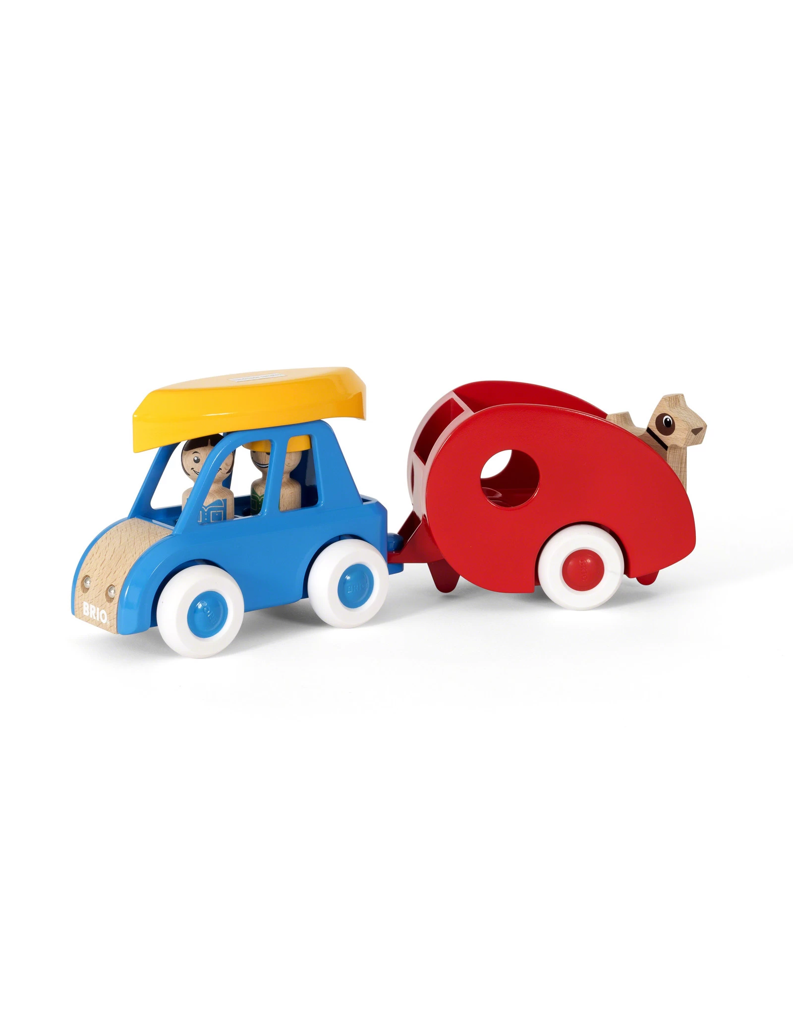Tijd om te genieten van het buitenleven! De BRIO-kampeerset is een klein wonder van speels design, met functies die je kind leuk vindt. Alle familieleden passen in deze speelgoedcaravan wanneer het tijd is om te gaan. De kano past netjes op de auto – en heeft zelfs plaats voor de hond wanneer je wegpaddelt.