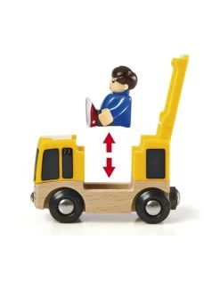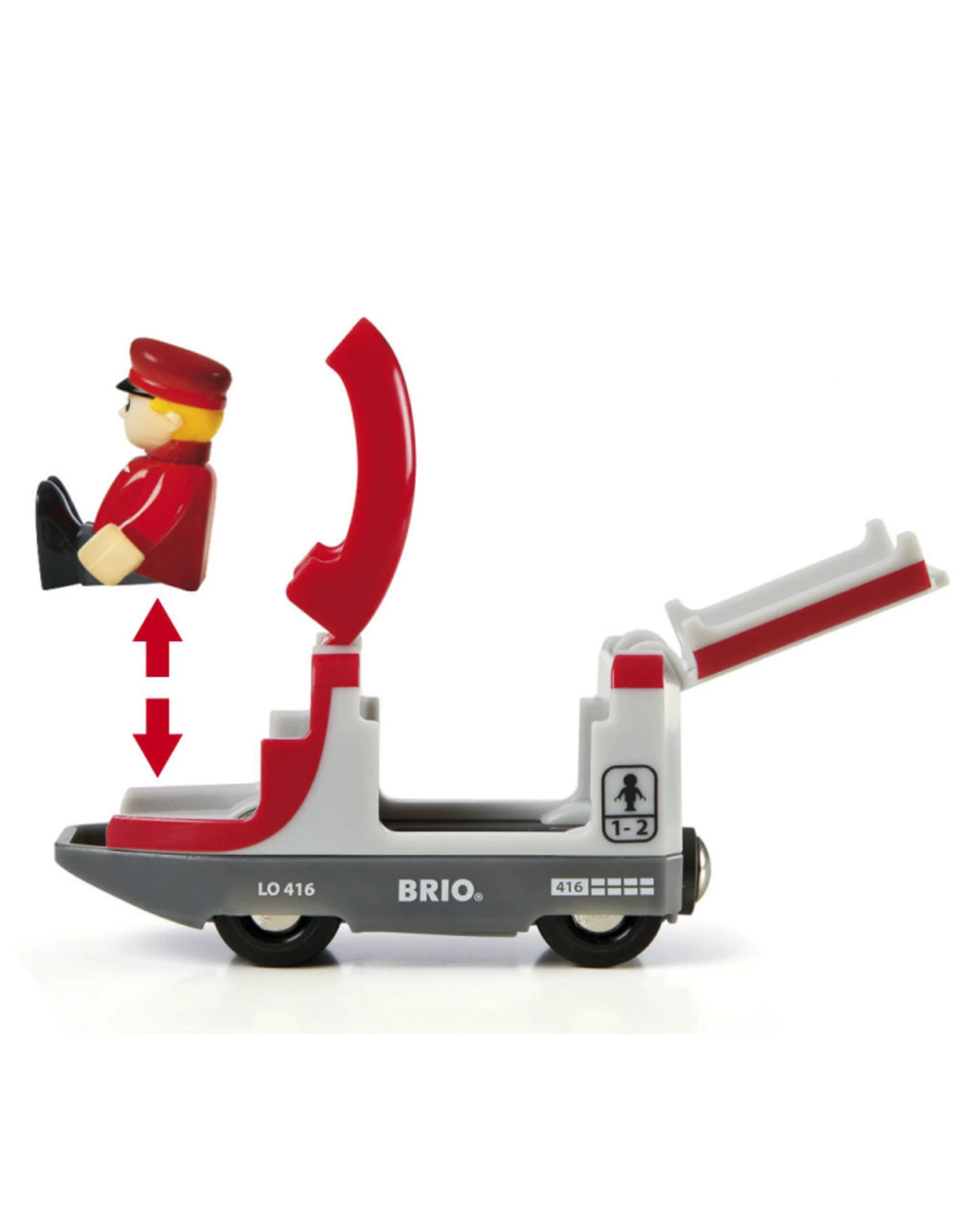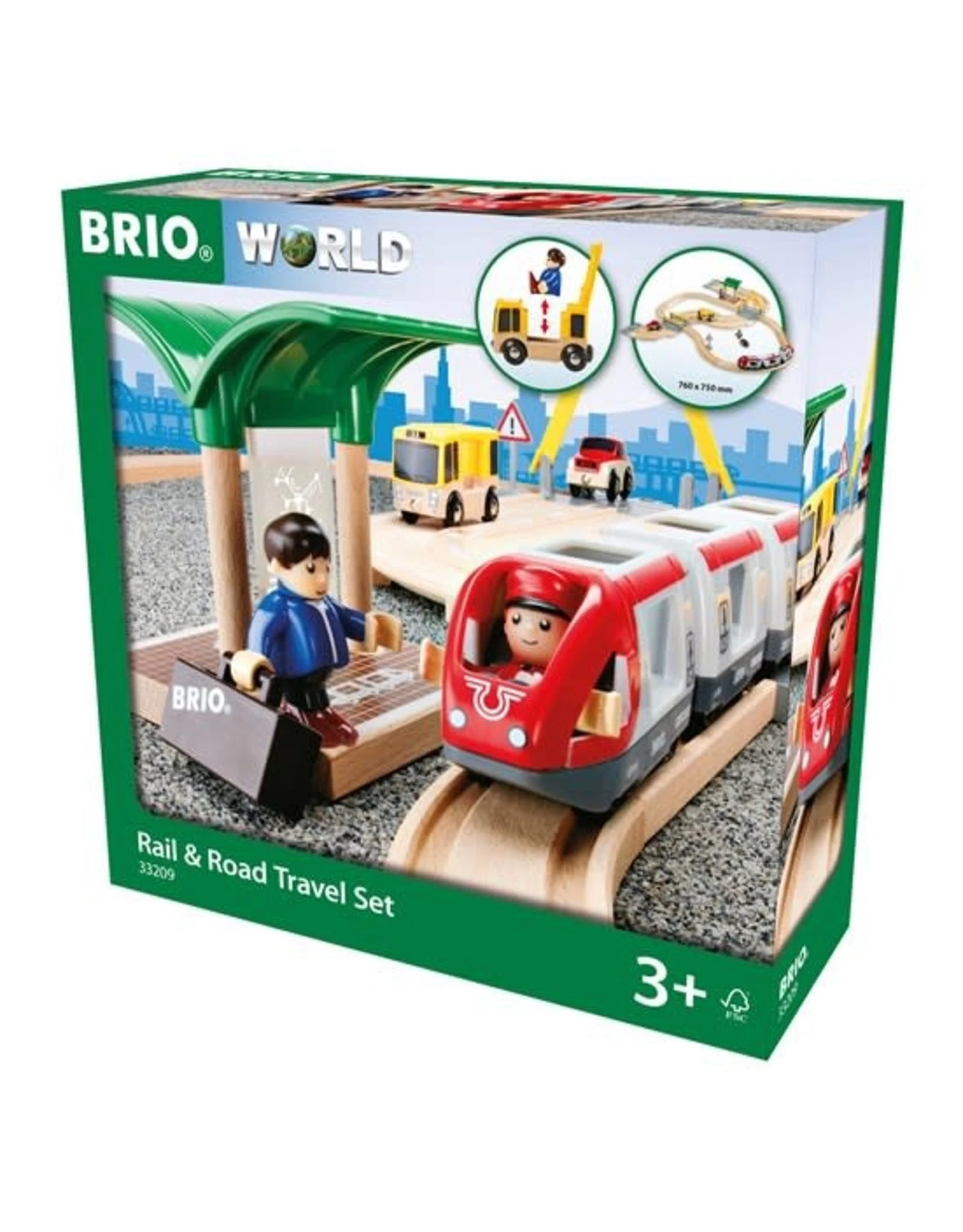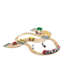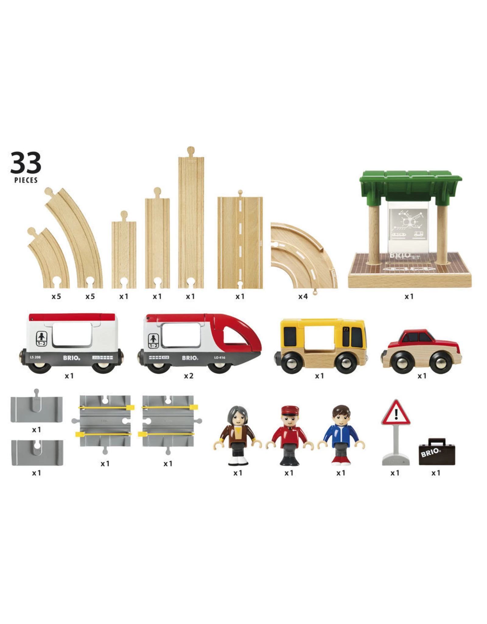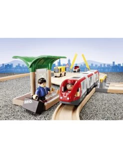 Daar komt de passagierstrein! De trein met twee wagons staat klaar om de passagiers mee te nemen voor een ritje door deze prachtige treinwereld van BRIO. Kijk uit het raampje hoe de auto’s stoppen op de weg die het spoor kruist. Gelukkig is de trein op tijd, want sommige passagiers moeten overstappen op de bus!