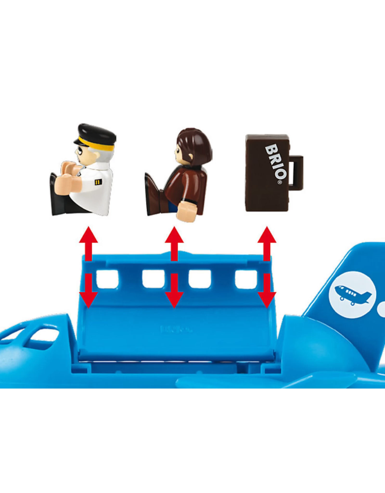 Klaar om op te stijgen! Het vliegtuig met drie zitplaatsen is nu gereed voor boarden en voor nieuwe, geweldige avonturen. Met een blauw vliegtuig met een paneel dat geopend kan worden om de passagiers neer te zetten, twee verstelbare figuurtjes, een rollende instaptrap en een koffer.
