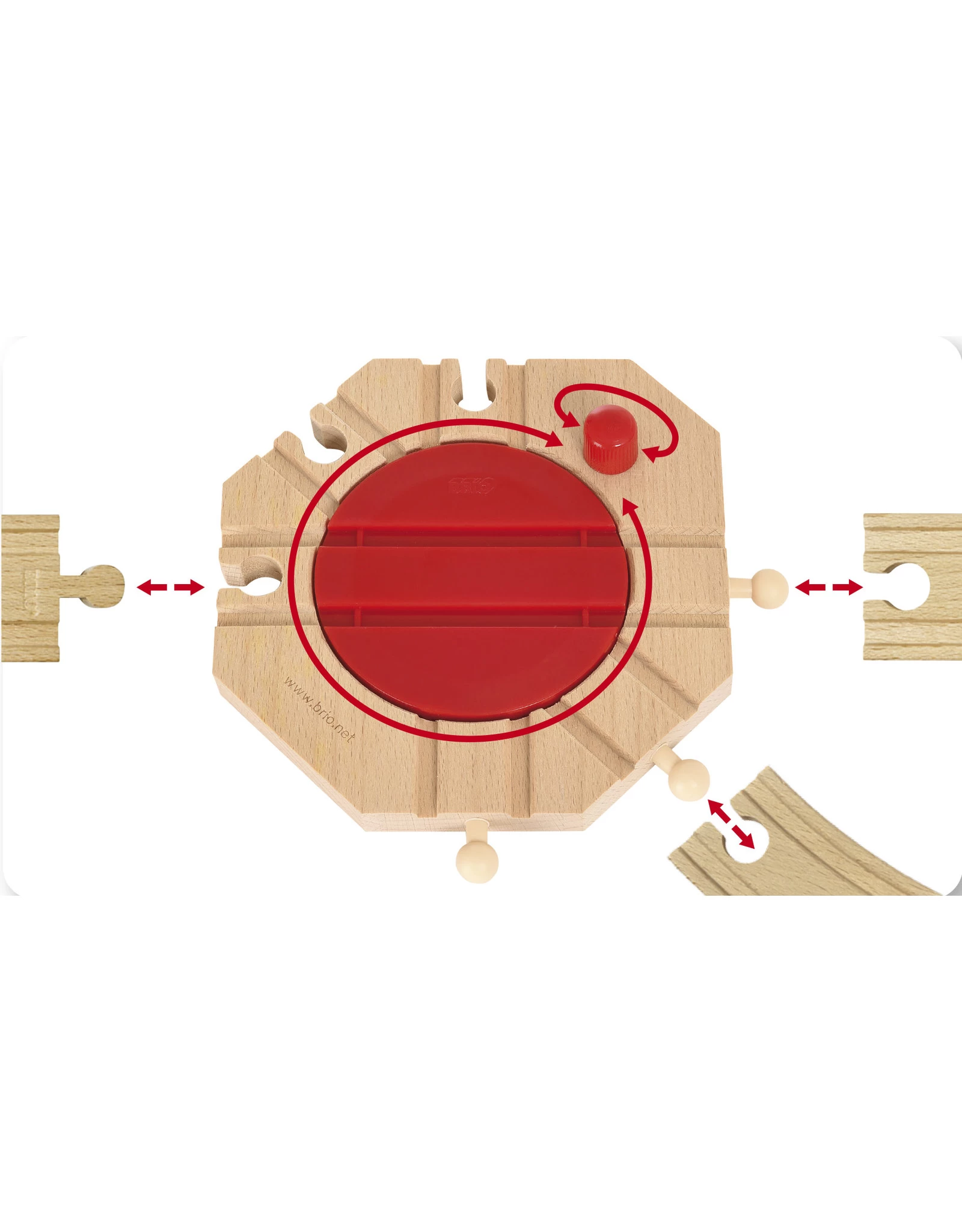 Hoe kan de trein draaien? Probeer deze draaischijf eens. Hij heeft tandwielen en die kun je met een druk op de knop bedienen.