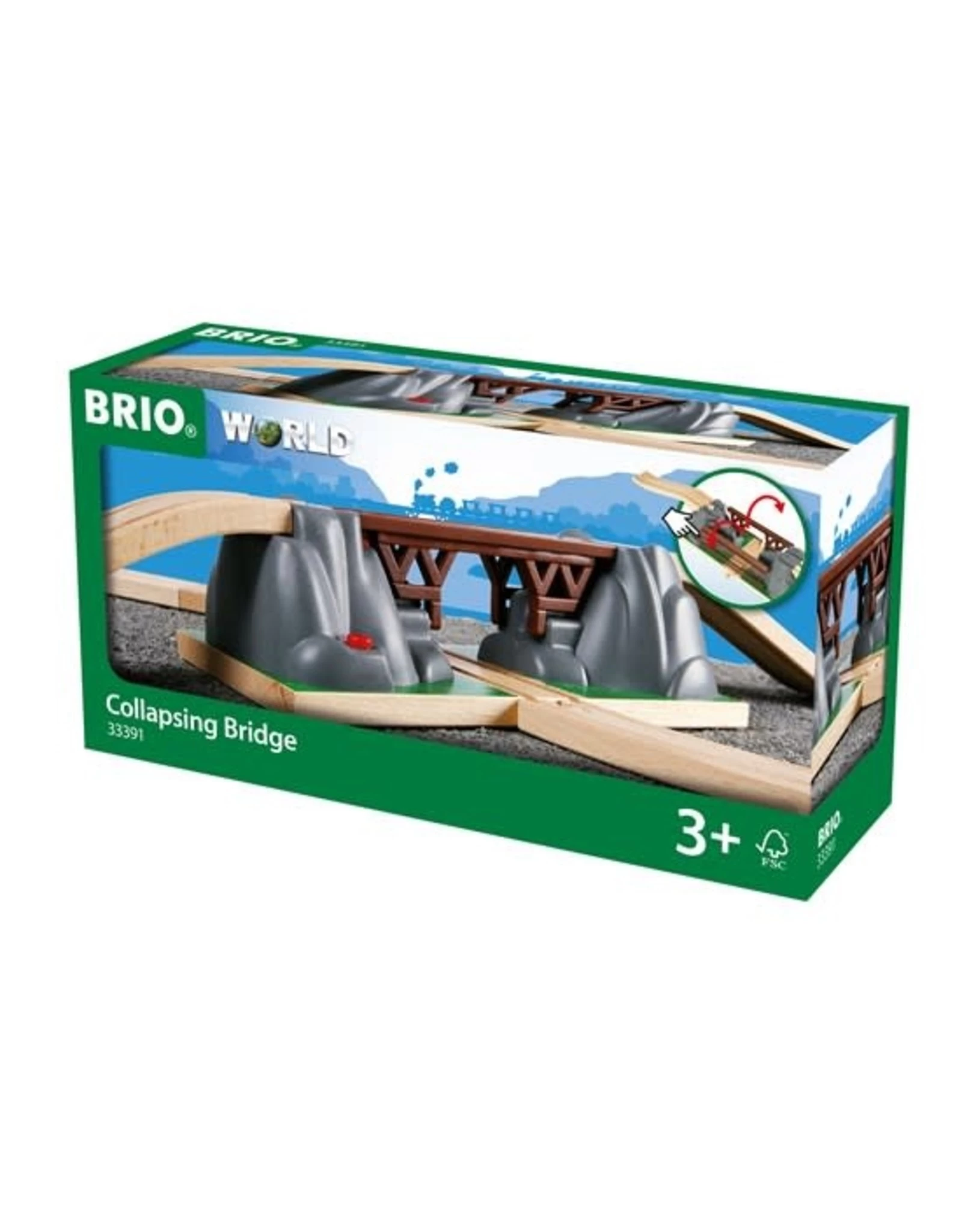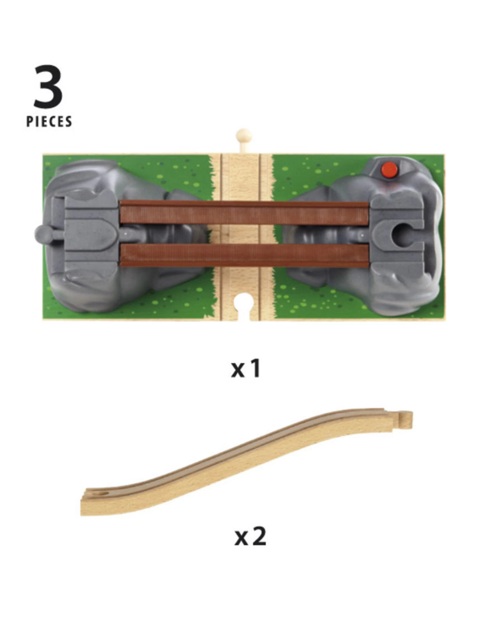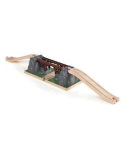 Op uw plaatsen, klaar, inklappen! Druk op de rode knop om de brug in te klappen zodat er geen treinen door kunnen tot de brug opnieuw gebouwd is. Met 2 hellende rails en een houten basis met ingebouwde rails voor meer spoorverbindingen.