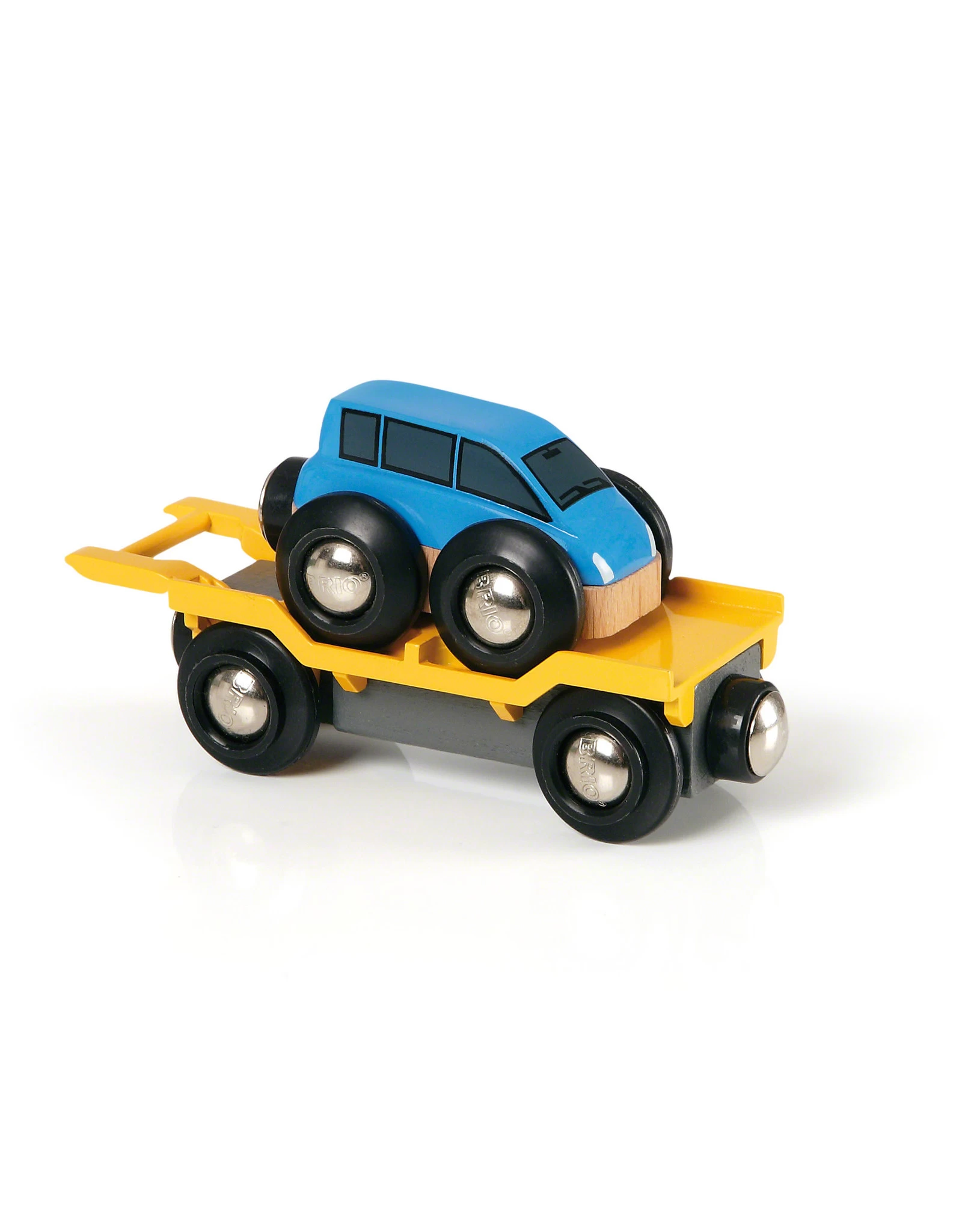 Voeg deze autotransporter toe aan je spoorwegwereld, samen met een fonkelnieuwe BRIO-wagen. Laat de auto op en van de transporter rijden door de klep neer te laten. Bevestig twee of meer transporters voor nog meer plezier – de auto’s kunnen van de ene wagon naar de andere rijden.