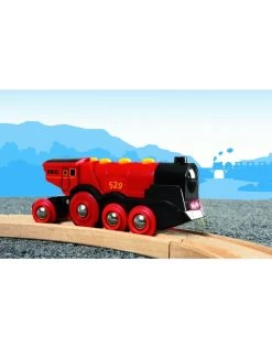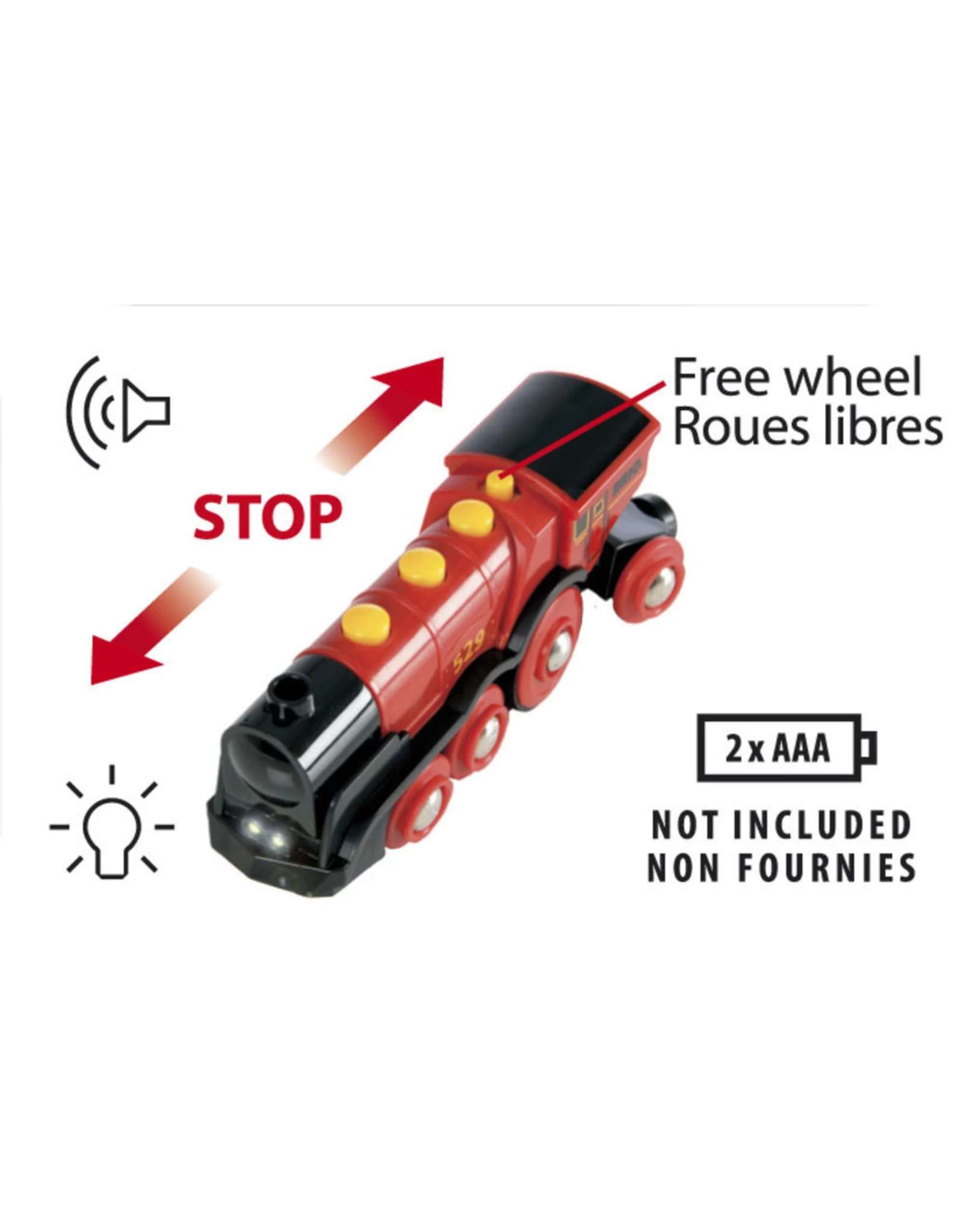 Hou ambitieuze treinmachinisten bezig! De grote locomotief op batterijen heeft twee koplampen en manuele knoppen voor ‘volle kracht vooruit’, achteruitrijden en het typische ’toettoet’-geluid. Een schakelaar bovenaan plaatst de wielen in de vrije stand, zonder batterijfunctie.