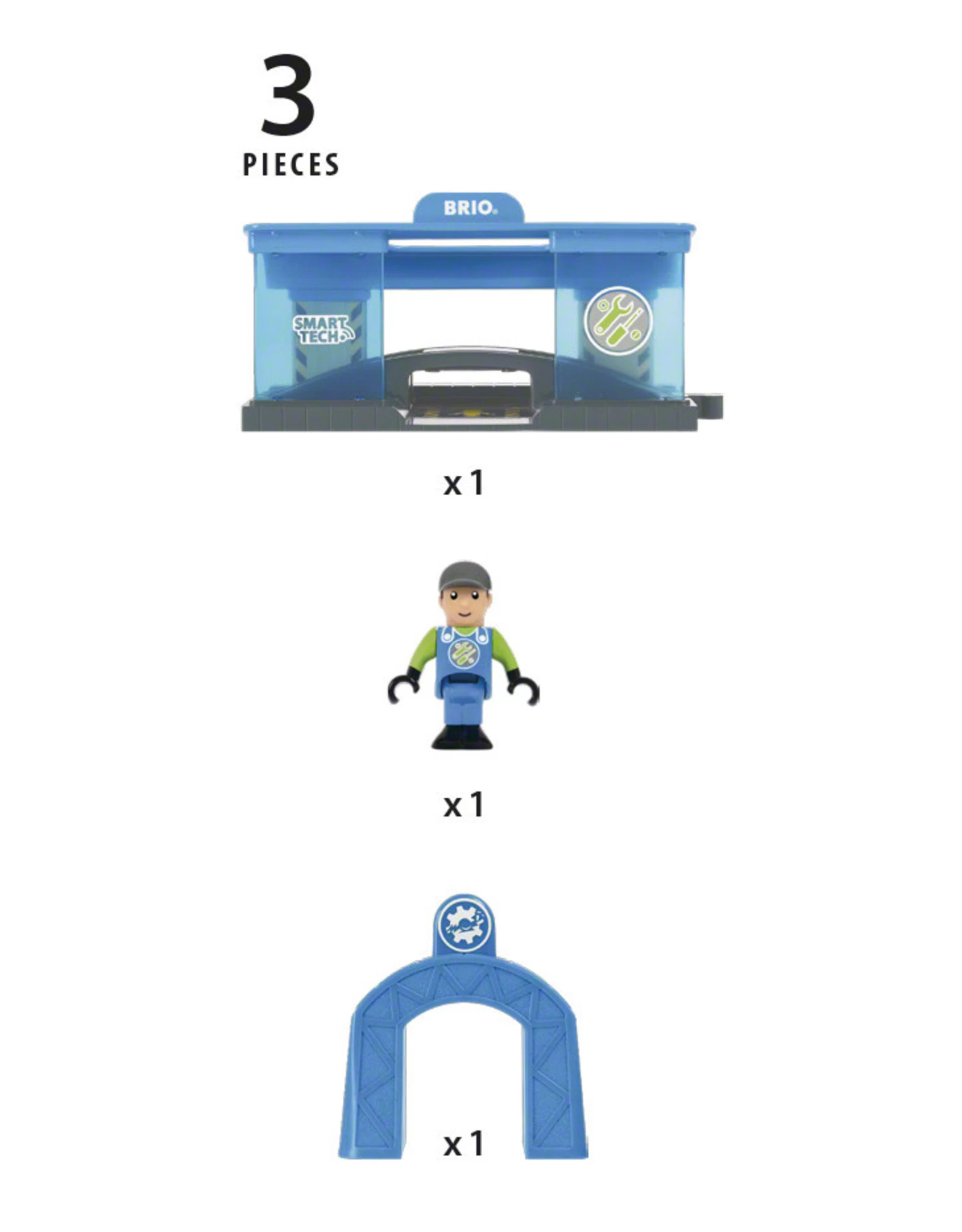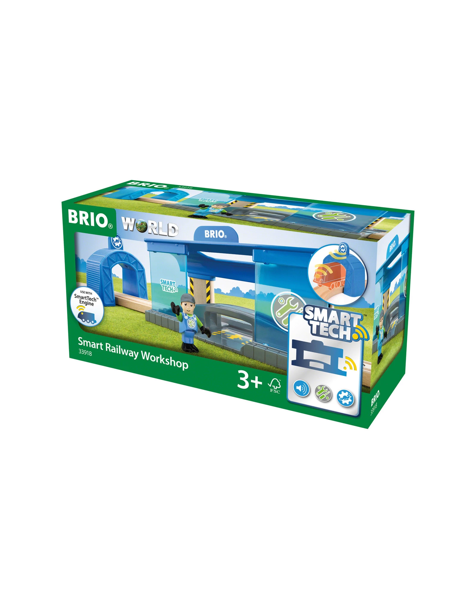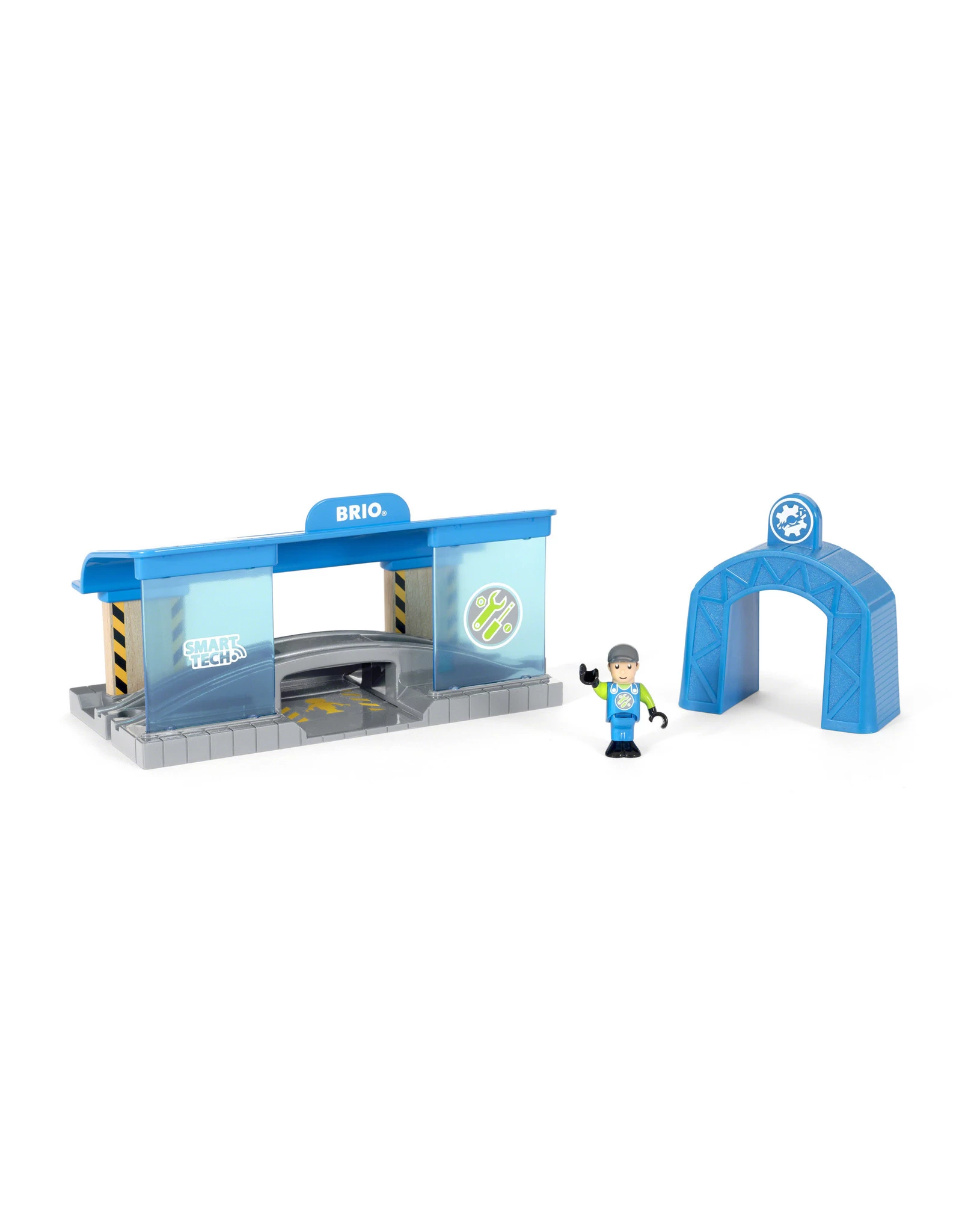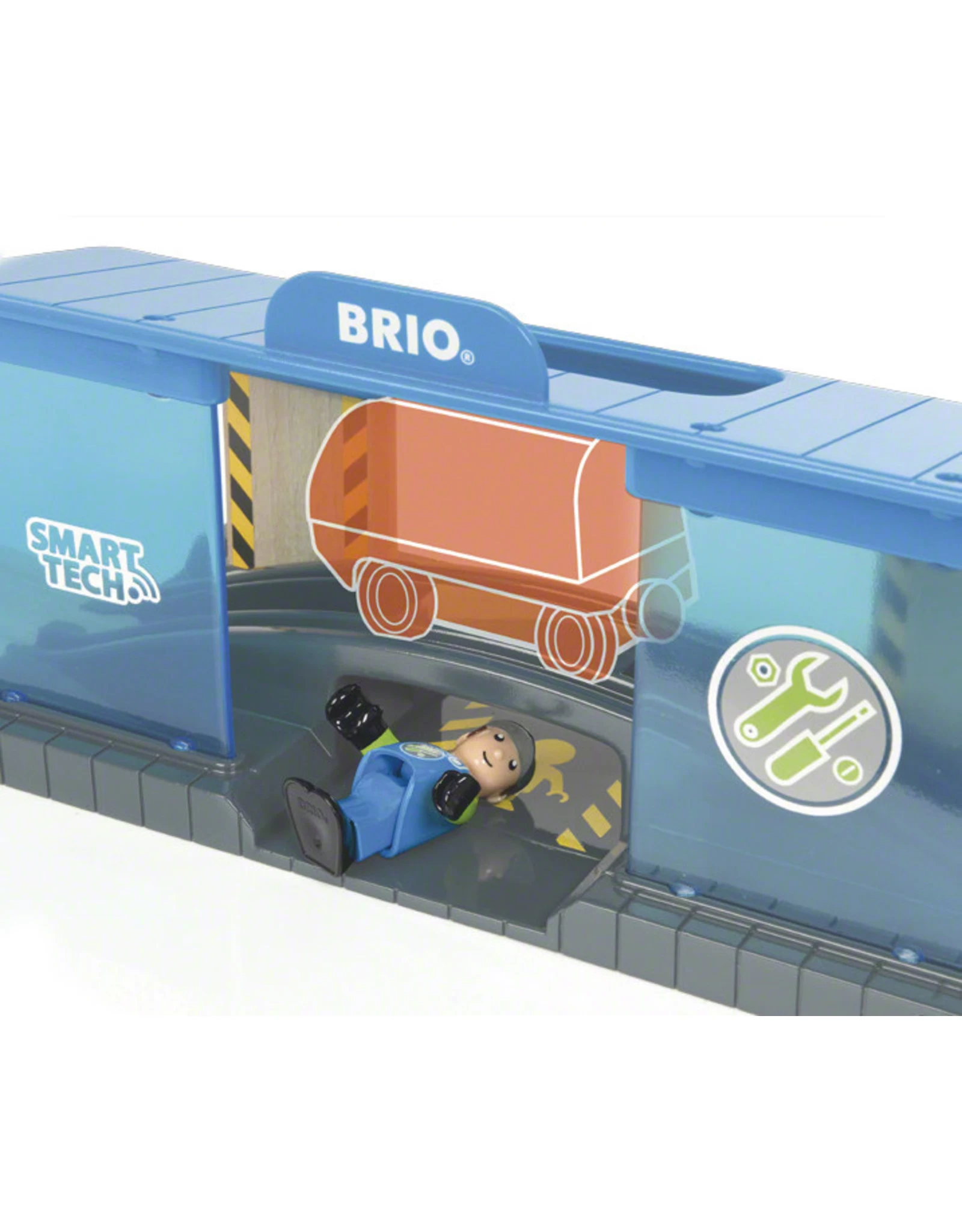O nee, de trein is kapot gegaan! Gelukkig komt alles weer goed met de Smart Tech Werkplaats. Wanneer een locomotief een actie tunnel passeert, begint hij raar te klinken en doen. Daarna rolt hij door naar de werkplaats, en stopt boven de reparatie ruimte. Het is tijd om je kunsten te laten zien! BRIO Smart Tech speelgoed werkt het beste met de BRIO Smart locomotief, om de geluids- en actie effecten mogelijk te maken.