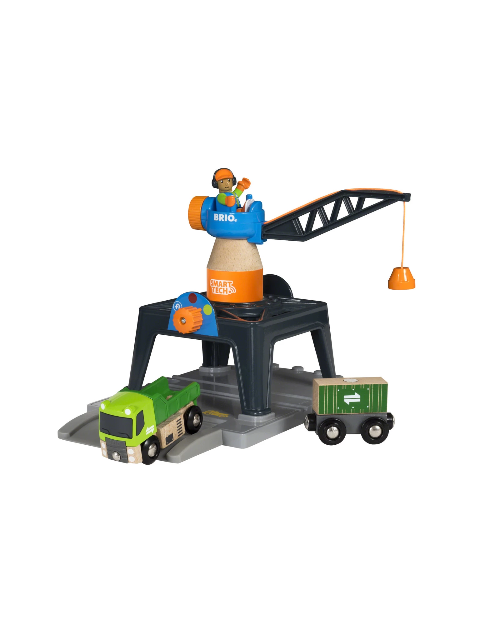 Hef en laad houten vrachtcontainers van treinen, vrachtwagens en boten met de Smart Tech Containerkraan. Hoog bovenop zit de kraanmachinist, die de magneet van de kraan gebruikt om lading te heffen en van en naar BRIO World voertuigen te vervoeren. De 360° roterende speelgoedkraan werkt ook in combinatie met de Smart Tech locomotief (niet inbegrepen). Via een schakelaar worden vooraf geprogrammeerde lichteffecten, geluid en bewegende animaties voor de locomotief geactiveerd. Zo kun je realistische rollenspellen spelen.