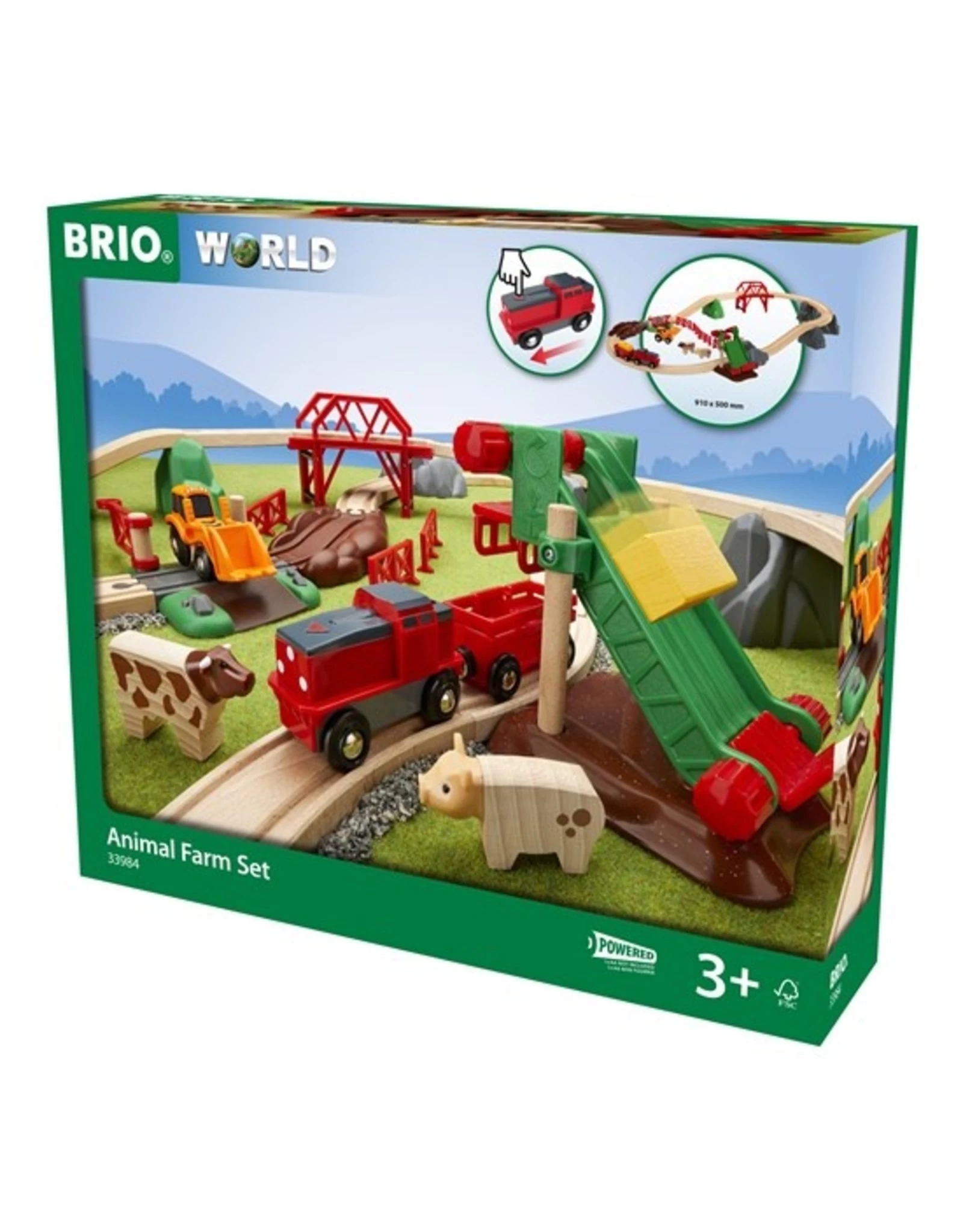 De 30-delige 33984 Animal Farm-set brengt je weer in contact met de natuur met zijn rustgevende landelijke setting. De vrachtlocomotief op batterijen is onderweg en klaar om de dierenvoeding op te halen en af te leveren bij de speelse dieren. Gebruik het hooilaadstation in deze speelgoedtrein om het hooi op te pikken en het in de vrachtwagon te laten vallen. Rij dan door de heuvels tot je bij de boerderij komt, waar de tractor al staat te wachten om het eten aan de wachtende dieren in de weide te brengen.