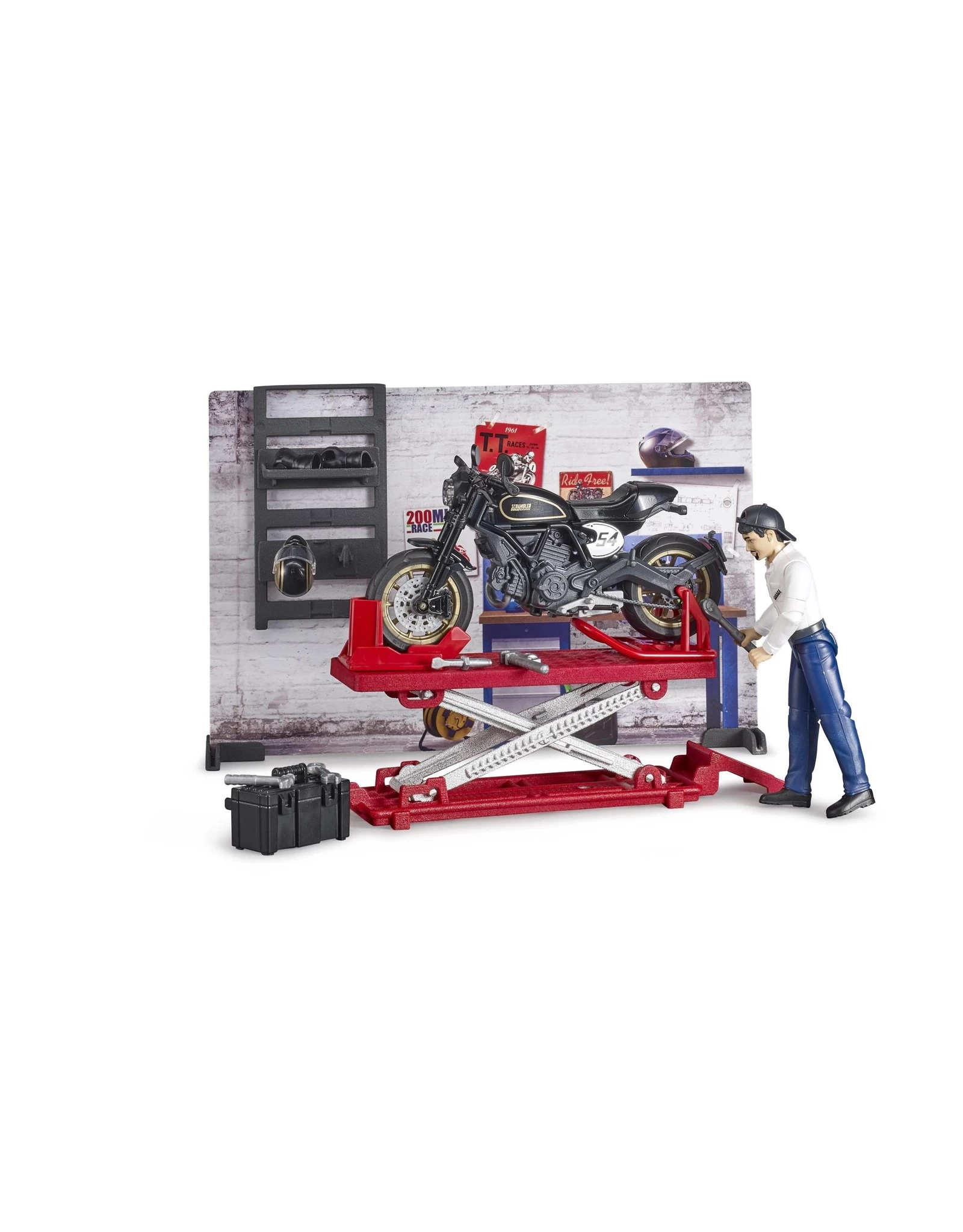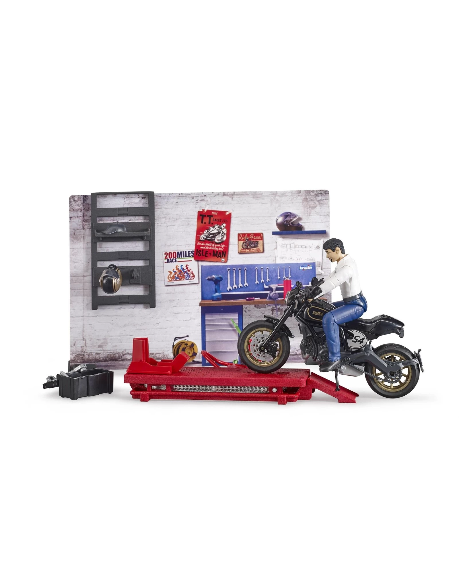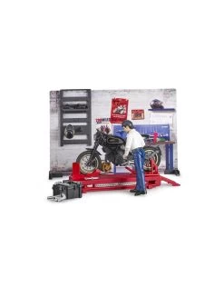 De werkplaats voor motoren is een paradijs voor schroevendraaiers. De gedetailleerde Scrambler Ducati Cafe Racer wordt met beugels aan de lift bevestigd en kan worden onderhouden. De monteur heeft hier voor een gereedschapskist inclusief uitgebreide apparatuur beschikbaar. In de tussentijd kunnen de helm en handschoenen in het wandrek worden bewaard totdat ze nodig zijn voor een proefrit. De bworld-werkplaats voor motoren kan gemakkelijk worden gecombineerd met de andere bworld-themasets.