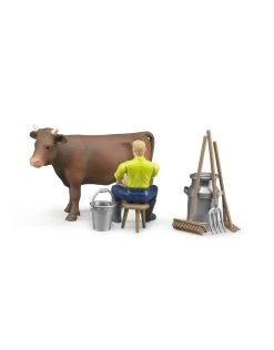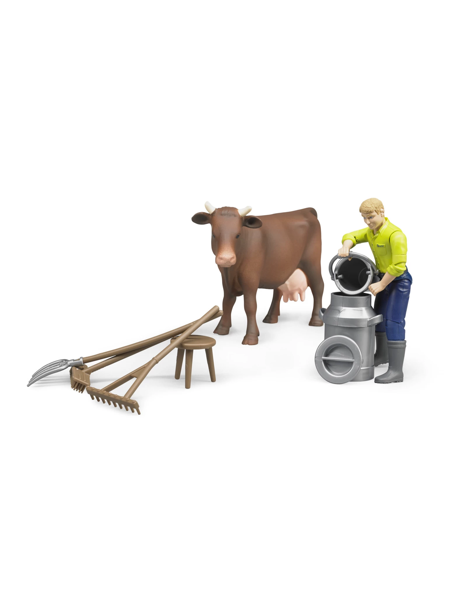 B-World speelset van Bruder. De landbouw figurenset bestaat uit een koe, boer en benodigheden om de koe te melken en een melkbus.