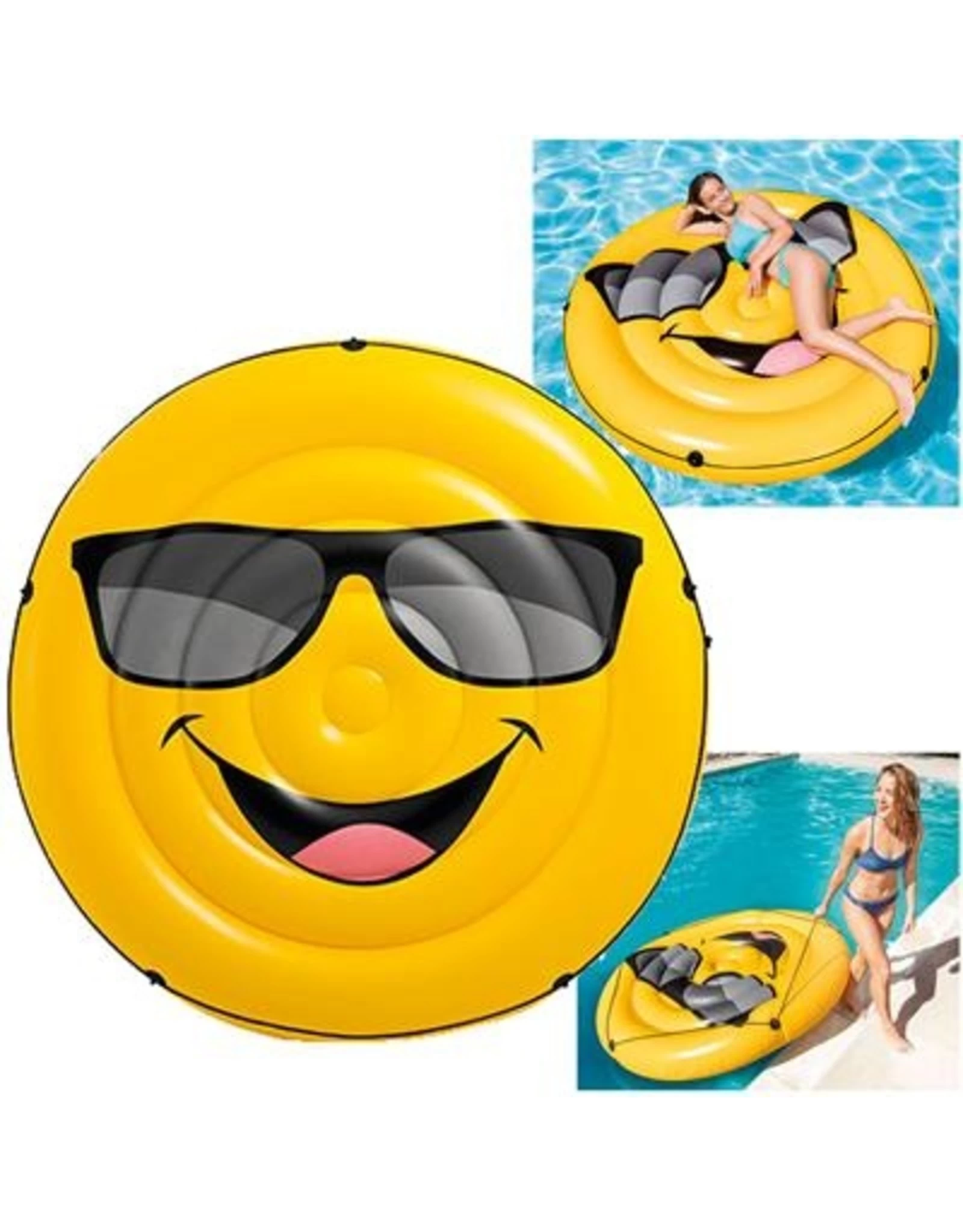 Coole Intex opblaasbare matras met smile emoticon, ideaal om te ontspannen in de zon of om plezier te hebben met vrienden! Ideaal voor twee personen en gemaakt van hoogwaardig meerlagig vinyl om een robuust en betrouwbaar product te garanderen. De opblaasbare matras is gemaakt met een ronde structuur met een diameter van 173 x 27 cm met geïntegreerd stevig touw voor de hele omtrek van het product, perfect om te bewegen en de beklimming en afdaling te vergemakkelijken. Inclusief reparatievel. Maximaal draaggewicht: 200 kg.