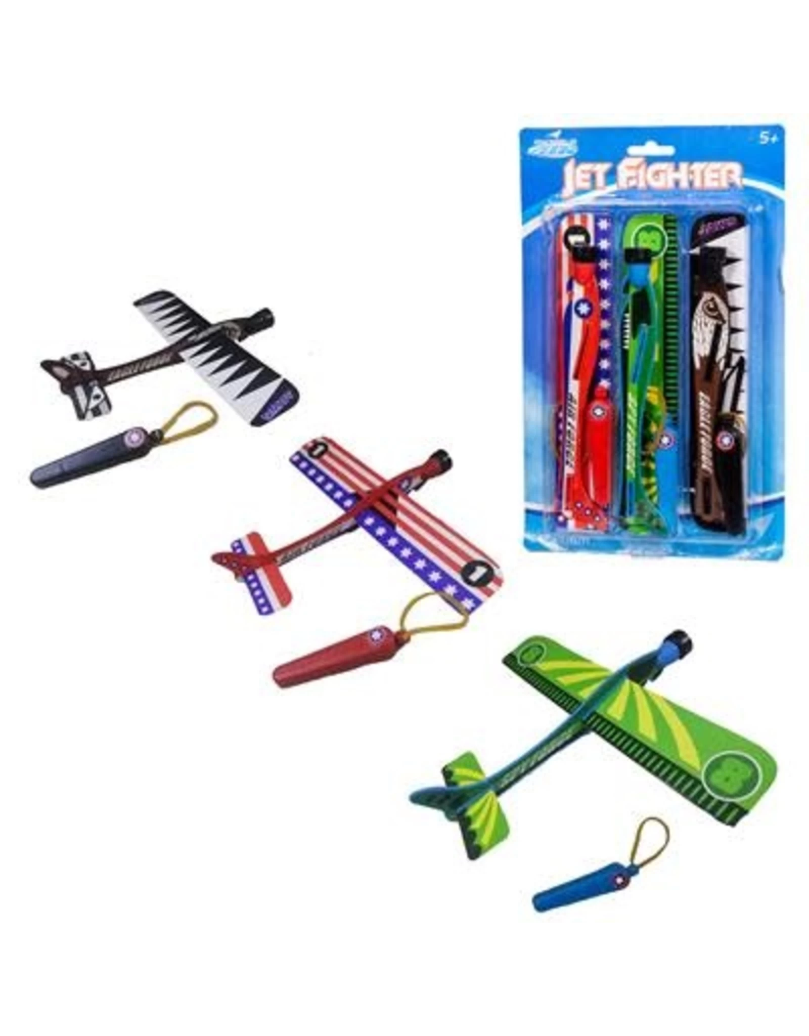 Rhombus Air Jetfighters 3-pack. Aanspannen met het bijgeleverde elastiek en wegschieten maar! Breedte van de vleugels: 22,5 cm. Gemakkelijk in elkaar te zetten. Wordt assorti geleverd op blisterkaart. Geschikt voor kinderen vanaf 5 jaar.