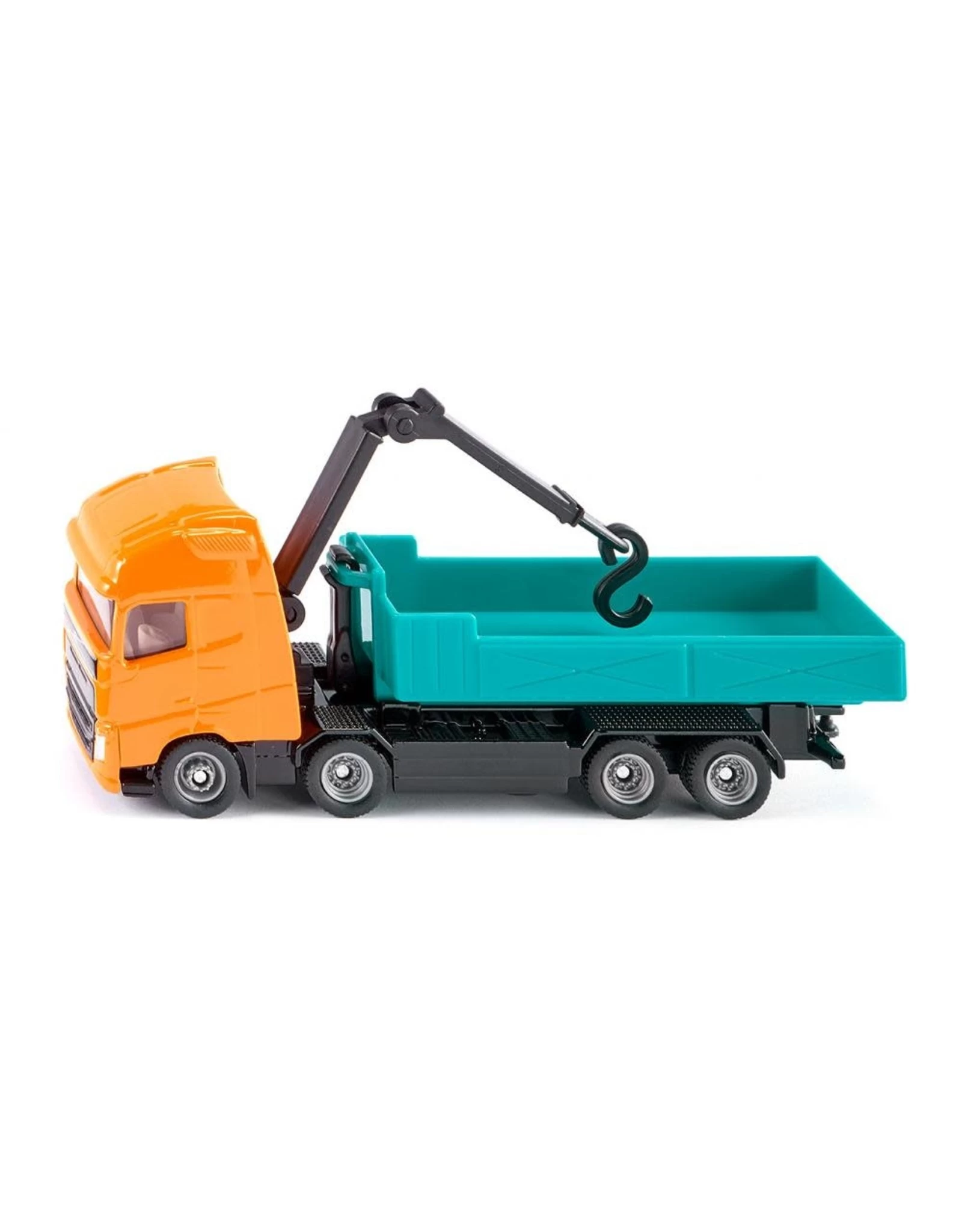 500 PK, vier assen, haaklift en kraan: de SIKU SUPER Volvo FH afrolkipper is de multifunctionele vrachtwagen voor de bouw. De kraan kan 360° worden gedraaid en grijpt de zware lasten met de haak vast. De kraan is uitgerust met twee stevige scharnieren en kan daardoor in verschillende posities worden gemanipuleerd. De bak kan met de haaklift op de bouwplaats nauwkeurig worden geplaatst en later weer op de wagen worden getrokken. De bak kan worden geladen met de Manitou telescooplader (1482), de Liebherr Radlader (1477) of de Linde vorkheftruck (1311).