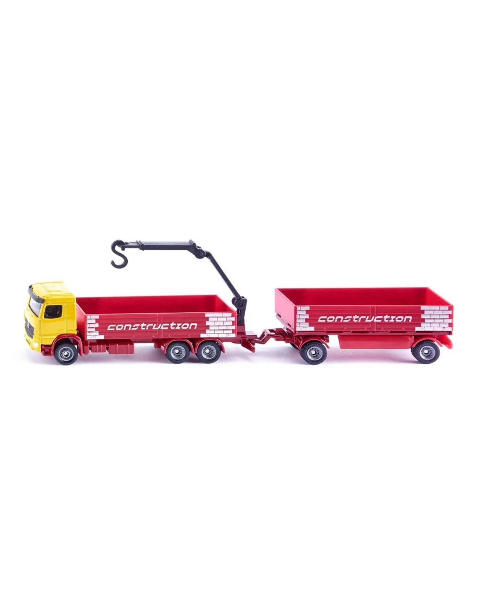 Mercedes-Benz Arocs chauffeurscabine op een lang drie-assig chassis met open laadbak en kraan en een twee-assige aanhanger met open laadbak. Deze typische aanvoertruck voor allerlei bouwplaatsen brengt nu ook de benodigde materialen naar de SIKU-bouwplaats in de kinderkamer of naar de SIKUWORLD. Met de beweegbare kraan kunnen de trekker en de aanhanger zonder problemen worden beladen. Voor het beladen kunnen de meest uiteenlopende materialen aan de stevige kraanhaak worden bevestigd.