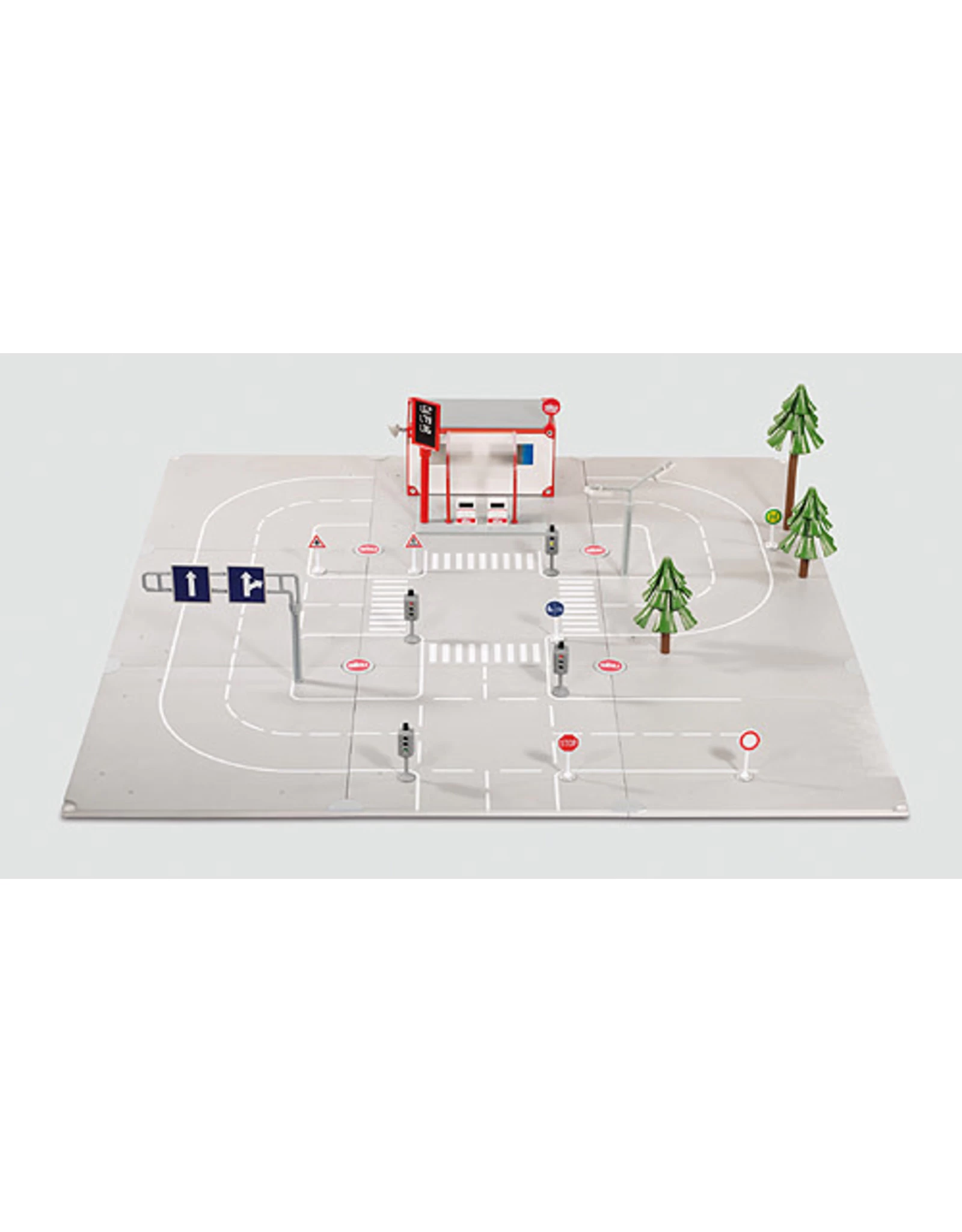 Starterset bestaande uit straatelementen, koppelstukken, tankstation, bomen, verkeersborden, etc.