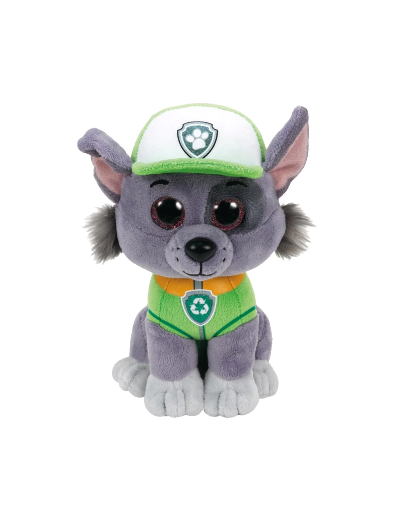 Pluche Paw Patrol Rocky knuffeltje in een groene outfit. De knuffel heeft de bekende TY ogen en is 15 cm groot.